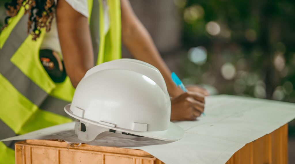 Técnico revisando planos de construcción en proyecto gestionado por promotora inmobiliaria.