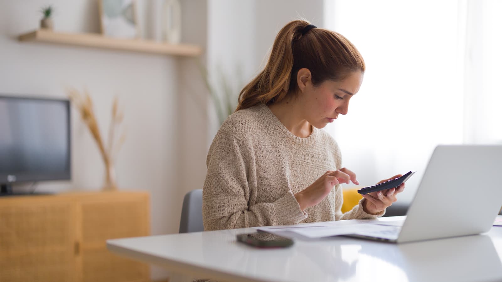 Persona revisando documentos y calculando costes de hipoteca antes de firmar una vivienda de obra nueva.