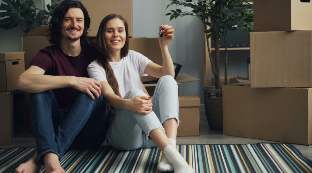 Pareja joven con llaves de su nueva vivienda tras analizar los costes de la hipoteca.
